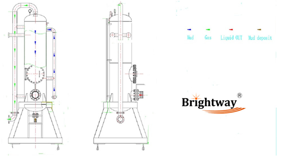 BWZYQ系列液氣分離器是在石油鉆井中處理鉆井泥漿氣浸的專用設備。氣浸鉆井泥漿從分離器進液口切線進入分離器內,順著罐體內壁落在專業設計好的內擋板上,發生對此碰撞,從而增大暴露表面積,向下流動,造成紊流狀態,使鉆井泥漿里含有的氣體和液體分離開來。游離在罐內的氣體通過灌頂的氣體出口排出,排氣管長度由現場確定及配套,并引到安全處,而脫氣后的鉆井液排入循環罐。